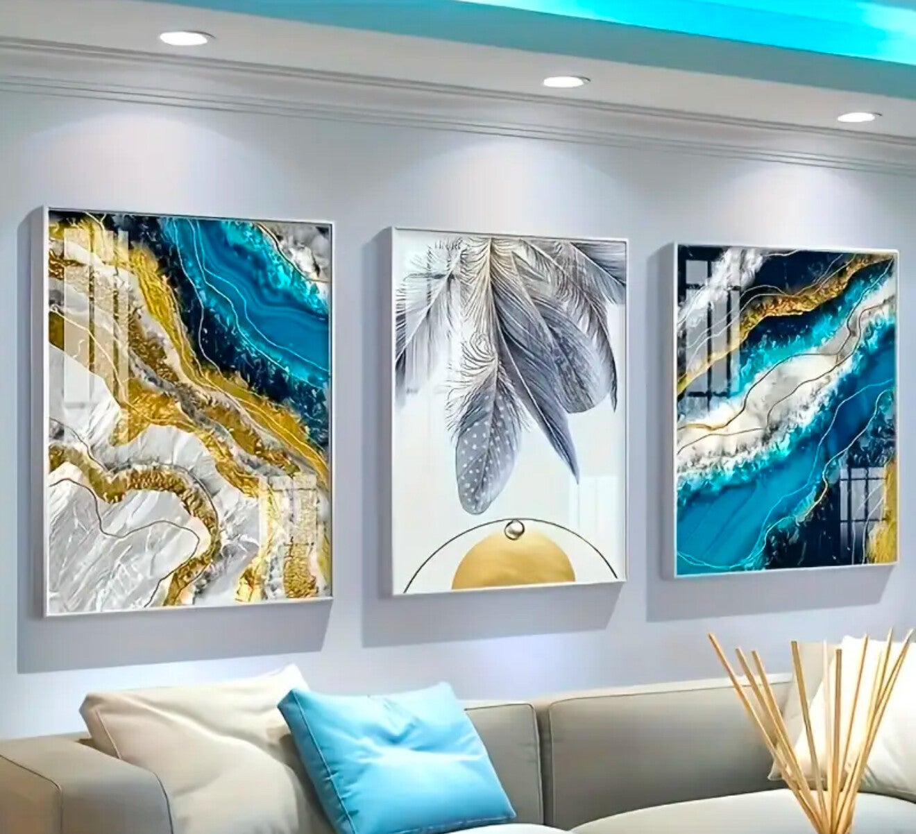 3 pièces - Abstraite Plume Vague de Mer Peinture Moderne Bleu Doré Luxe Image d'Art Mural pour Salon Chambre Décoration Murale /d’art mural encadré peinture abstraite en cristal de porcelaine pour salle à manger salon bureau chambre à coucher peinture de luxe